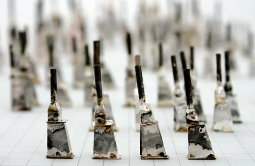 The smokestack are about multiples, and the compulsion to fabricate multiples. I became my own factory and assembly line: piercing out patterns, folding and soldering, producing everything in batches, and assembling parts for many before the whole.